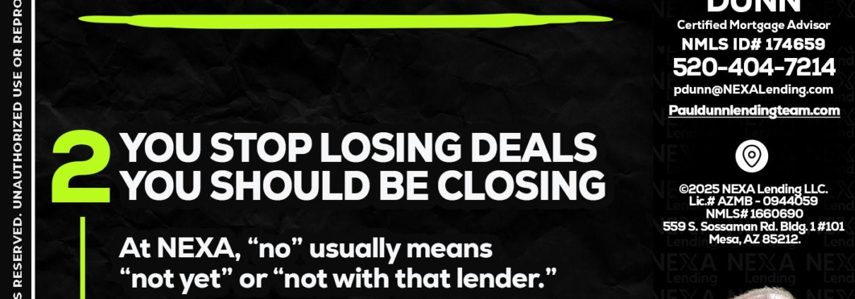 Hi, my name is Paul Dunn. I’m a Loan Officer with NEXA Lending LLC., offering personalized mortgage solutions, fast customized quotes, great rates and service with integrity.